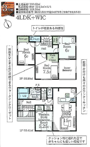 プロパンガス・公営水道・本下水・システムキッチン・カウンターキッチン・浴室乾燥機・温水洗浄便座・全居室収納・床下収納・ウォークインクローゼット・ペアガラス・モニター付インターホン・火災報知器・敷地内駐車3台可能・長期優良住宅・私道持分214.5㎡の内1/5有