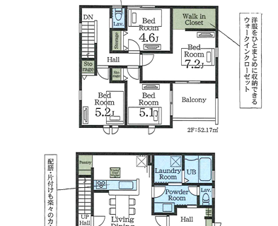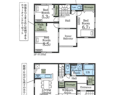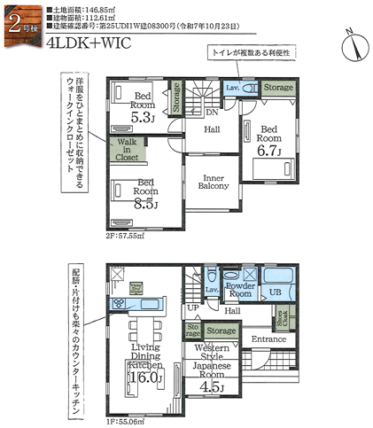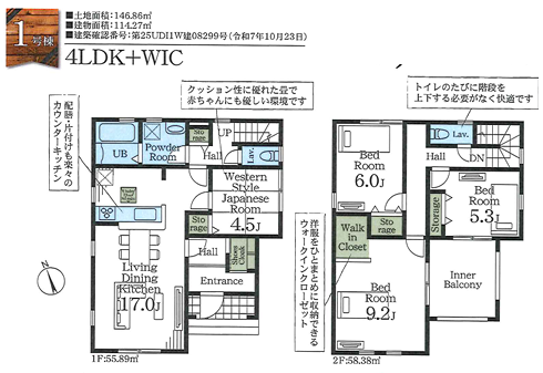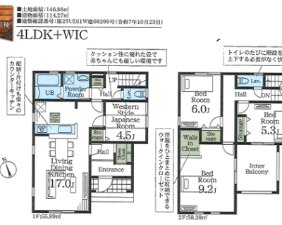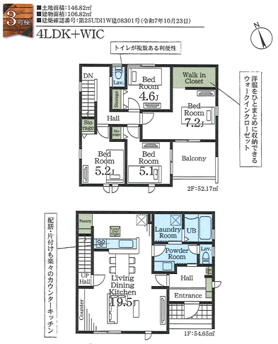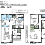 土地面積 146.82㎡(44.41坪)~146.86㎡(44.42坪) 建物面積 106.82㎡(32.31坪)~114.27㎡(34.56坪)