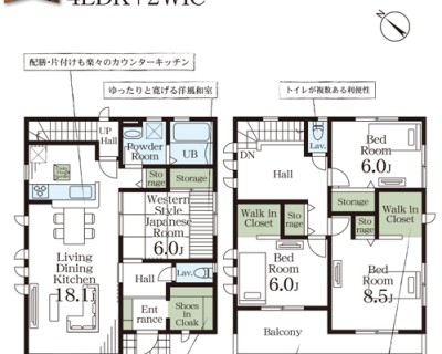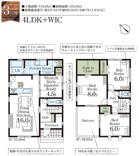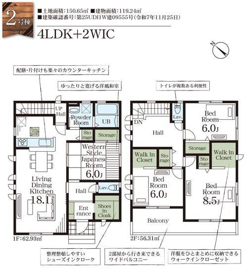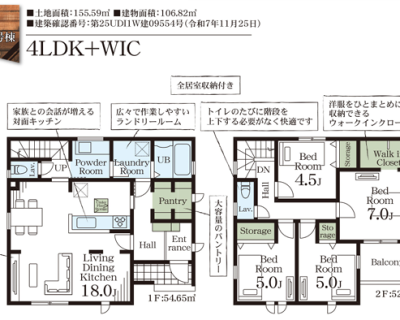 土地面積 150.65㎡(45.57坪)~155.59㎡(47.06坪) 建物面積 103.50㎡(31.30坪)~119.24㎡(36.07坪)